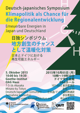 Unter dem Titel „Erneuerbare Energien als Mittler zwischen Klimapolitik und Regionalentwicklung – Ziele und Erfahrungen in Japan und Deutschland“ bringen die Deutsche Botschaft Tokyo, das Research Center for Advanced Science and Technology (RCAST) der University of Tokyo und das Deutsche Institut für Japanstudien (DIJ) Tokyo Akteure der lokalen Ebene in Japan und Deutschland mit Experten und Praktikern aus Wirtschaft, Wissenschaft und Politik zusammen. Die Potenziale erneuerbarer Energien und alternativer Ressourcennutzung für Kommunen und Regionen sollen diskutiert und die Erfahrungen in Japan und Deutschland verglichen werden.