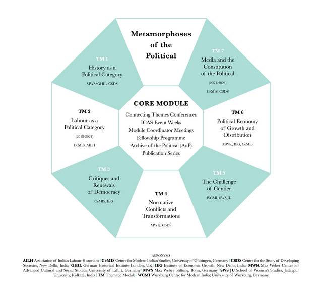 Ein essentielles Anliegen des Projekts ist es, Wissenschaftlerinnen und Wissenschaftler mit ähnlich gelagerten Forschungsfragen miteinander in Dialog zu bringen, die bisher aufgrund ihrer regionalen Spezialisierung noch keine Berührungspunkte hatten. Zu diesem Zweck wurde ICAS:MP als modulares Kooperationsnetzwerk konzipiert. Im Zentrum befindet sich das namensgebende Modul „Metamorphoses of the Political“ als rahmengebende und organisatorische Instanz. Daneben existieren sieben autonome, nach Themen unterschiedene Module, die sich auf folgende Schwerpunkte fokussieren: